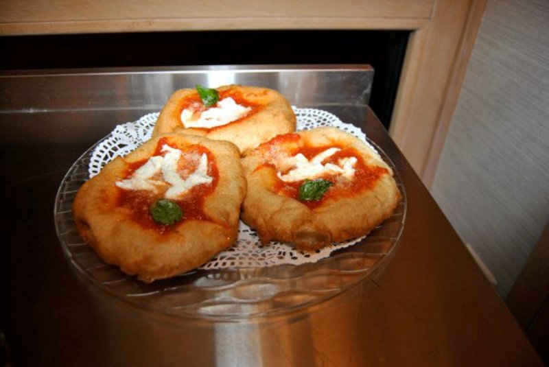 Una volta fritte, condite le pizzelle fritte con un paio di cucchiai di sugo, la mozzarella e (se piace) una spolverata di formaggio grattugiato.