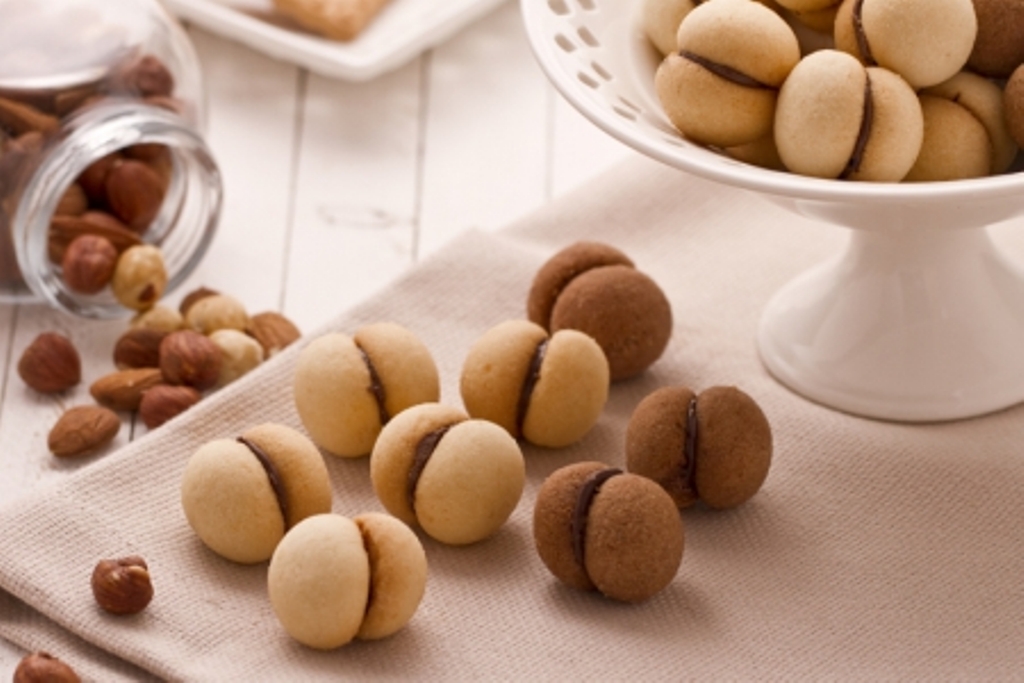 Una volta che l'impasto si sarà rassodato, suddividetelo in tanti bastoncini, da cui poi taglierete delle piccole porzioni di impasto (di circa 6-8 gr) che utilizzerete per formare delle palline. Disponete le palline di impasto su una placca da forno, foderata con l'apposita carta. Rimettete di nuovo le palline così formate in frigorifero per almeno altri 30 minuti. Dopodiché infornate e lasciate cuocere in forno statico a 160 gradi per circa 20 minuti, o fino a che la base del biscotto non si sarà dorata; se utilizzate il forno ventilato, la temperatura sarà di 135 gradi.