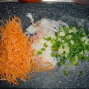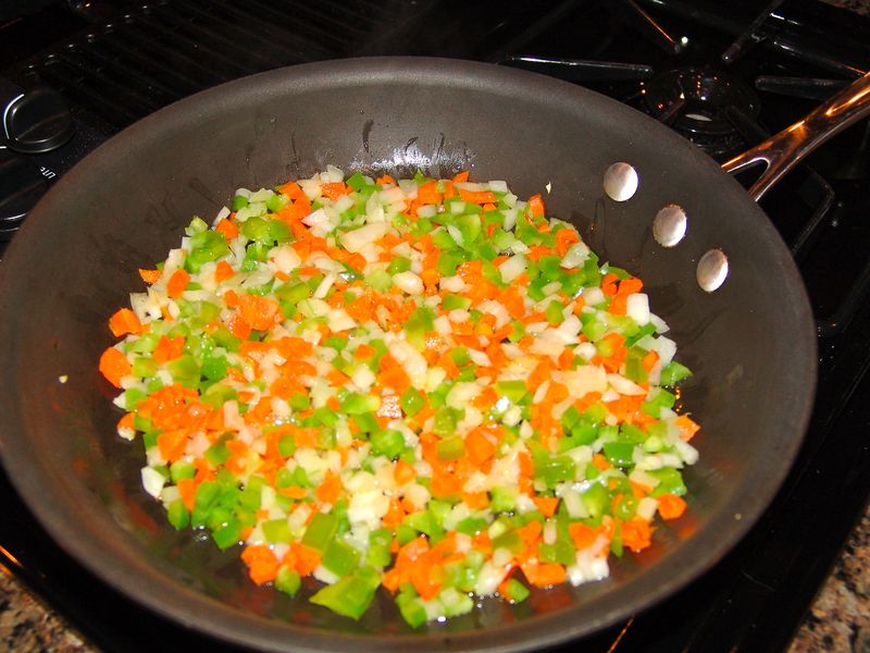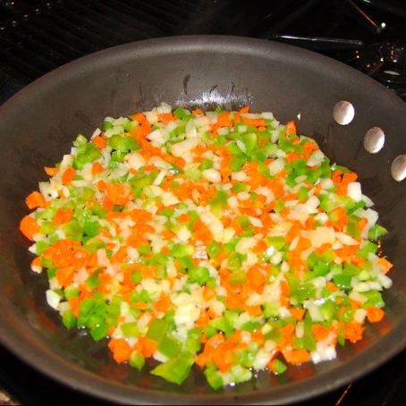 Scaldare in una padella un pò di olio e aggiungere il trito di verdure. Lasciare cuocere a fuoco basso per 15 minuti.