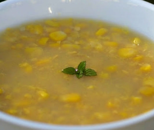 Unire successivamente il mais e lasciarlo cuocere per circa 5 minuti. Aggiungere il brodo fino a coprire completamente il mais e lasciar cuocere per 20/25 minuti con il coperchio. Aggiustare di sale e aggiungere una buona macinata di pepe. Spegnere il fuoco e tenere da parte un cucchiaio di mais che servirà per decorare il piatto. Frullare il resto e servire con un trito di prezzemolo e il mais messo da parte precedentemente.