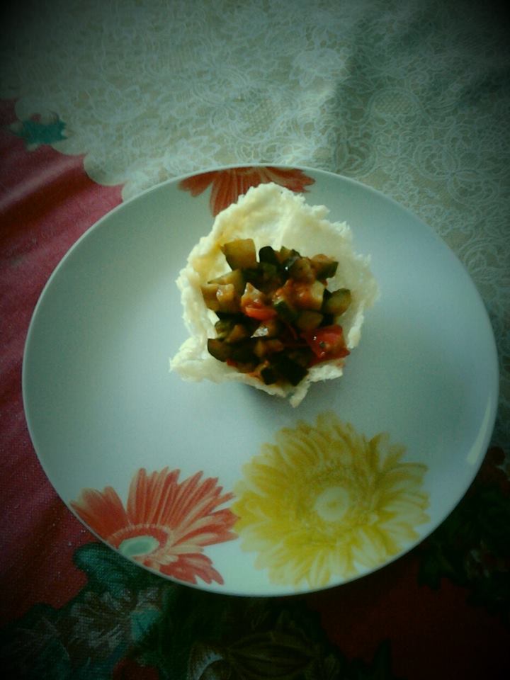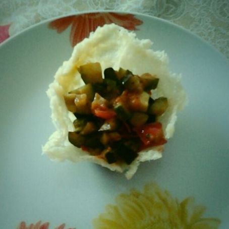 in un pentolino basso ben caldo sciogliere 3/4 cucchiai di parmigiano grattugiato. appena sciolto versarlo su una ciotolina in modo da darle una forma a cestino e lasciarlo raffreddare. continuare così finchè il parmigiano non finisce.