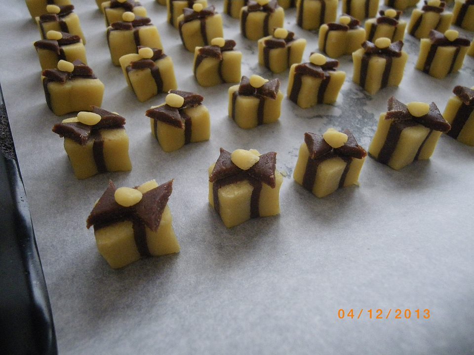 Ricoprite con la pellicola e fate rassodare (Continuate fino ad esaurimento dei composti al cacao e bianco. Ricordate di lasciare un piccola quantità di frolla al cacao e bianca per ricavare i fiocchetti). Una volta raffreddato tagliatelo perpendicolarmente alla sua lunghezza ricavando dei piccoli quadrati. Disponeteli su una teglia rivestita di carta forno. Dalla frolla al cacao ricavate dei triangolini che disporrete a due a due al centro di ogni quadratino. Completate ponendo una piccola pallina di pasta frolla bianca al centro di ogni coppia di triangolini per formare i fiocchetti.
