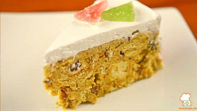 Mescolare bene e lasciare da parte per otstojat di non stare biscotti secchi. Tritare la noci, gelatina di caramelle, cioccolato e lasciare da parte per dopo.