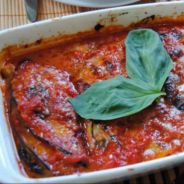 Coprire una teglia non troppo grande con carta forno, iniziare con poca salsa, porre poi un primo strato di melanzane, versare la salsa fino a coprirle, aggiungere il formaggio grattugiato, delle foglie di basilico, le fettine di uova e le fette di provola. Coprire con un altro strato di melanzane, versare la rimanente salsa e spolverare con abbondante formaggio grattugiato. Porre in forno a 180° per 20 minuti. Decorare con basilico fresco.