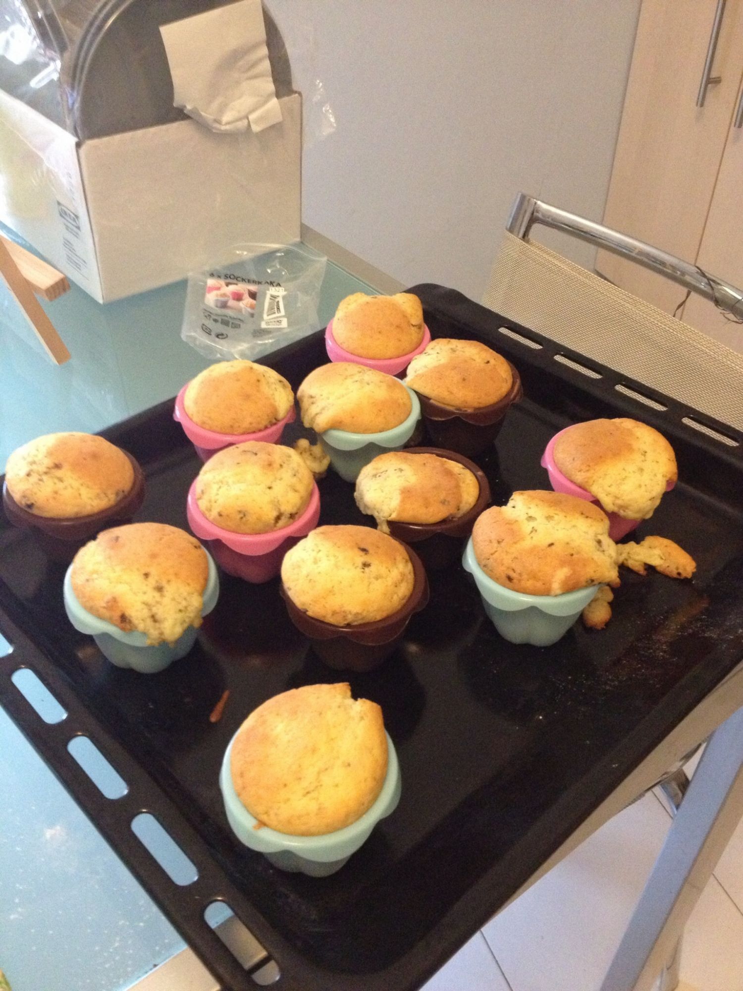 Unisci i primi due composti e poi gradualmente il terzo. Poi unisci le gocce di cioccolato. Versa negli stampini.