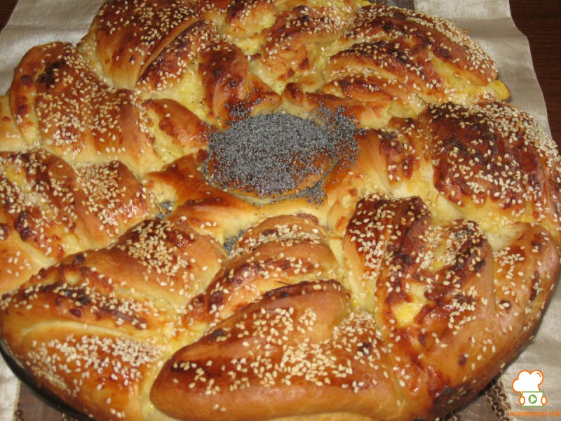 tutta la torta è ricoperta con uovo razmateno. Il cerchio in mezzo Cospargere con semi di papavero e di sesamo estremità.