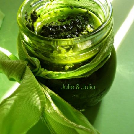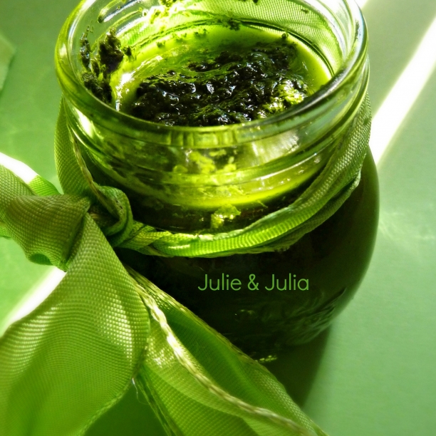 Staccate con cura le foglie di basilico e lavatele sotto l'acqua corrente e passatele nella centrifuga per rimuovere l'acqua in eccesso. Stendete le foglie su di un canovaccio e lasciatele asciugare tutta notte. Il giorno seguente mettete, un pò alla volta, le foglie di basilico in un mixer con l'aglio tritato, i pinoli e abbondante olio. Frullate finché non raggiunge la consistenza che vedete in foto. Prima di condire la pasta aggiungete un pizzico di sale e una grattugiata di pecorino.