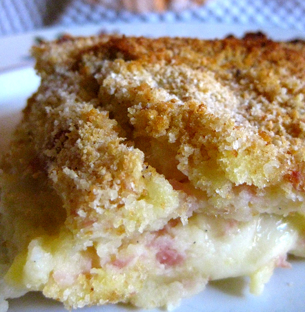 Incorporare al composto i precedenti ingredienti e mescolare per fare amalgamare bene. Imburrare e cospargere di pangrattato una pirofila da forno, poi adagiarvi il composto ottenuto e livellarlo con una spatola da cucina; cospargere la superficie del gateau con il rimanente grana grattugiato e fiocchetti di burro, poi infornare a 180° per i primi 15 minuti; portare poi il forno a 200° per i successivi 15 minuti, attivando la modalità grill. Terminata la cottura, sfornare il gateau e lasciarlo intiepidire per almeno 10-15 minuti, poi tagliarlo in porzioni e servirlo ancora tiepido.