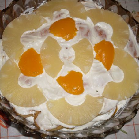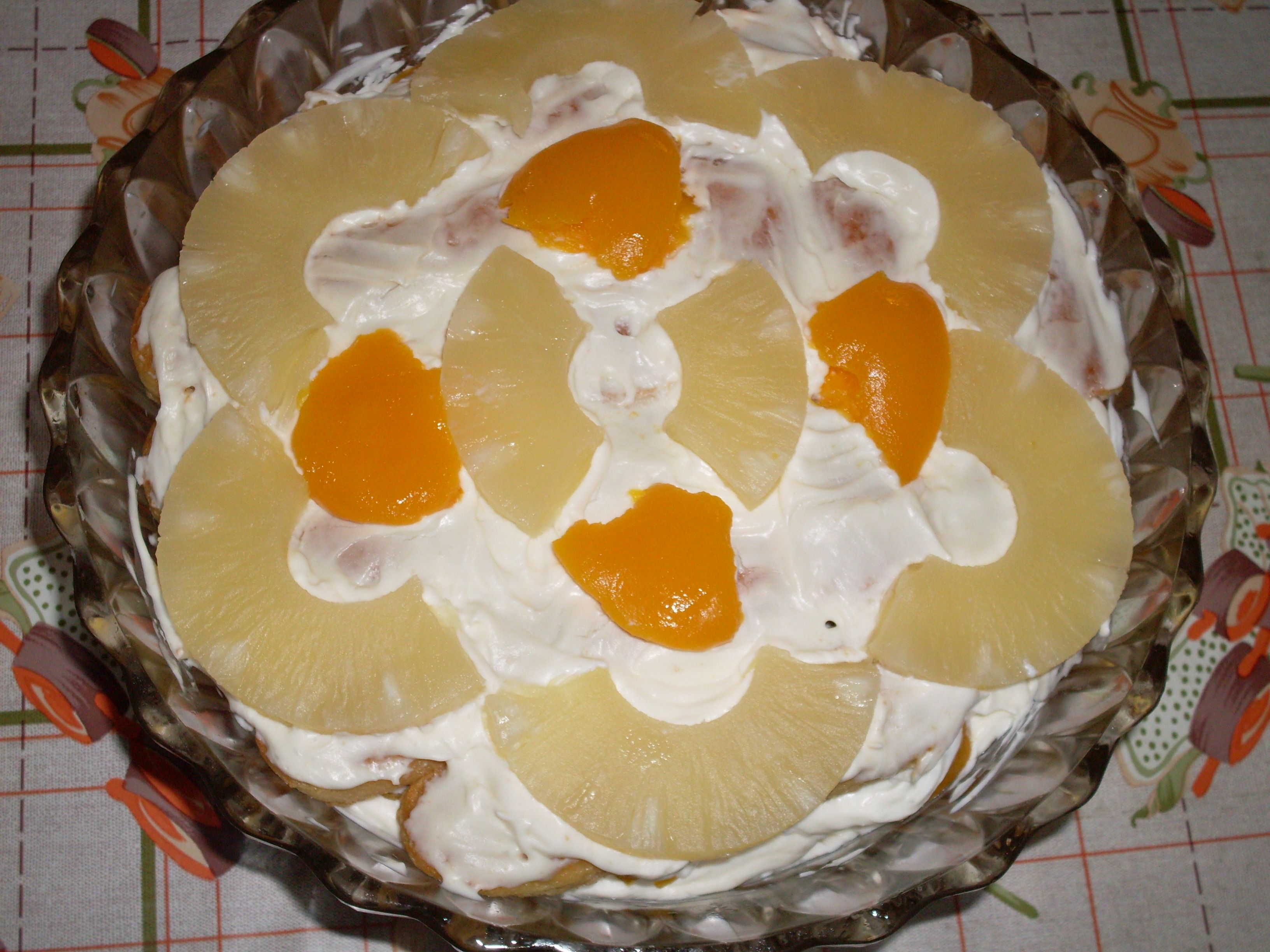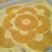 Stendere gli strati, utilizzando lo sciroppo della frutta per inzuppare i savoiardi, coprire con la crema e poi con la frutta tagliata a pezzetti, e continuare fino a esaurimento degli ingredienti, lasciando come ultimo strato la crema coperta dai pezzi di frutta.