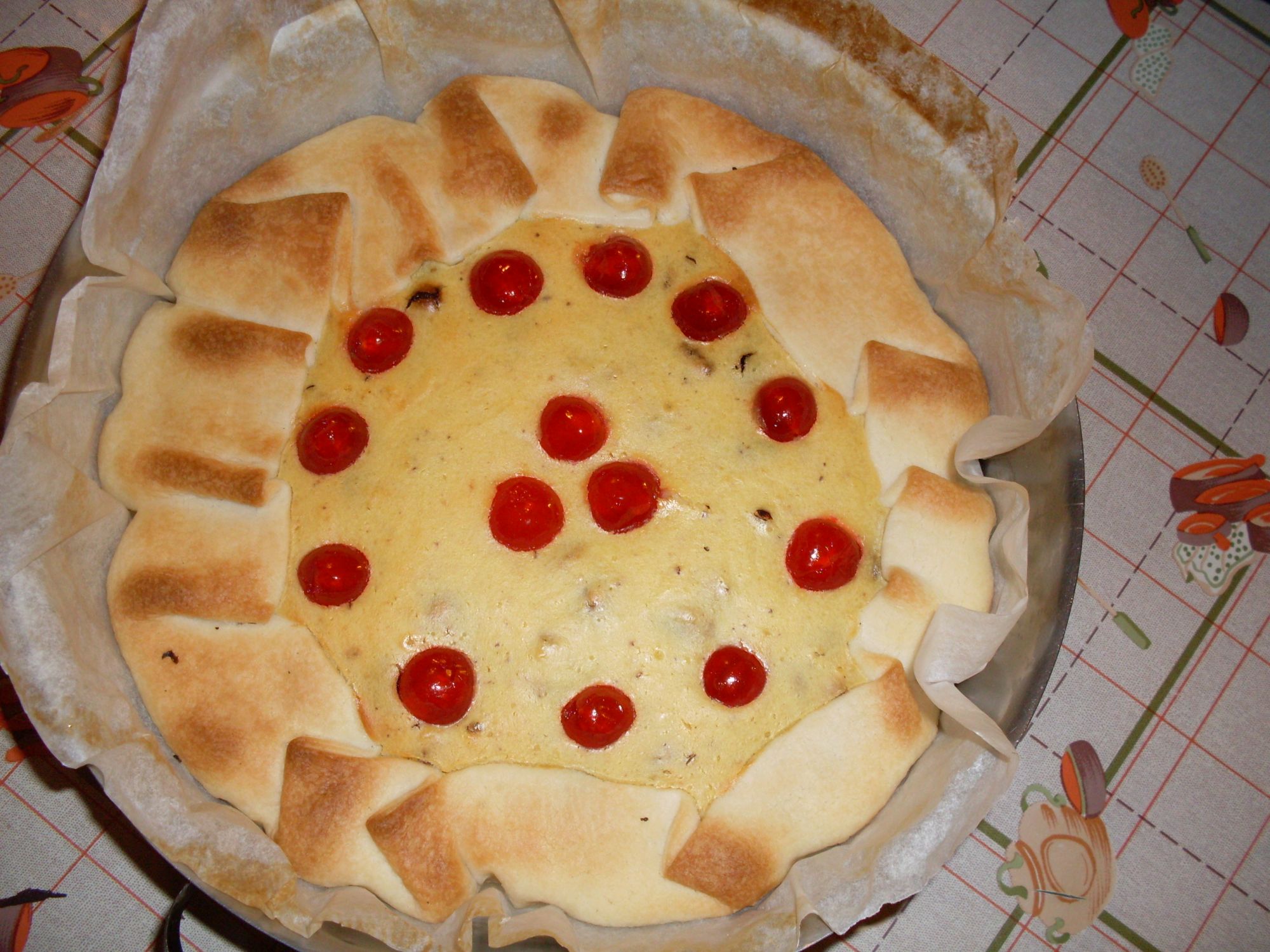 Guarnire in superficie con le ciliegie candite e cuocere in forno a 180° per circa 35 minuti, finchè la sfoglia diventa dorata.