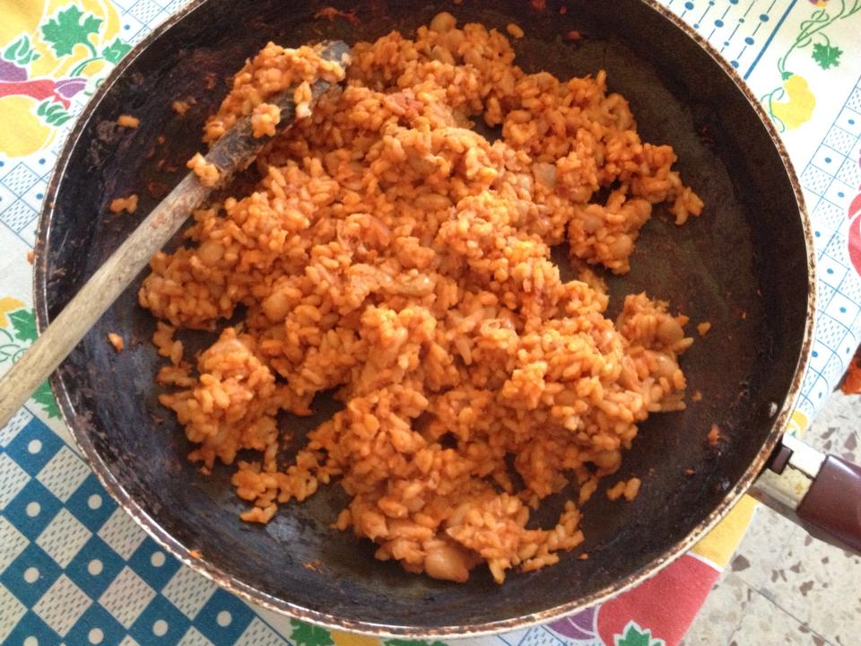 Quando il riso è cotto scolarlo e versarlo nella padella con il sugo e farlo saltare a fiamma vivace fino a che si forma sul fondo un' abbondante crosticina croccante.