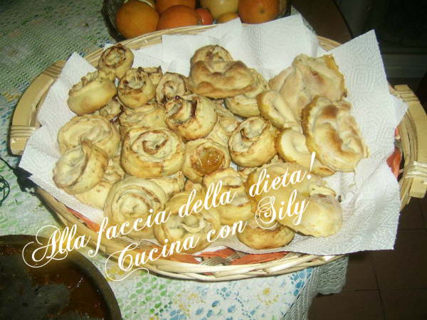 Come prima cosa prepariamo il ripieno , prendiamo una ciotola e mettiamoci lo zucchero,le mandorle (prima fatte abbrustolire e poi tritate) l'uva sultanina,i chiodi di garofano e cannella tritati e il cioccolato grattuggiato ma non troppo.Ora passiamo all' impasto,impasta la farina con le uova ,il vino e l'olio ,dopo aver impastato per bene stendi la pasta molto sottile (aiutatevi con la macchina) e ricavane delle strisce larghe piu o meno 7 cm e lunghe piu o meno 30 cm. metti un po di impasto in centro lungo tutta la striscia emetti dei tocchetti di marmellata e chiiudi immediatamente unendo i due lati schiaccia bene per farli aderire dopodiche' arrotola su se stesso tipo a chiocciola stringi bene dopo averle fatte tutte cosi, ungete un tegame o meglio la placca del forno con abbastanza olio e farina e adagiate sopra le sfgghiat prima di infornare ungetele con un pennello di olio e spolverate con un po di zucchero, a questo punto infornate a 180° e fate cucinare fino a che non siano belle colorate.fatele raffreddare molto bene,questi dolci durano anche un paio di mesi.