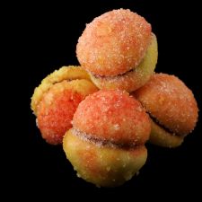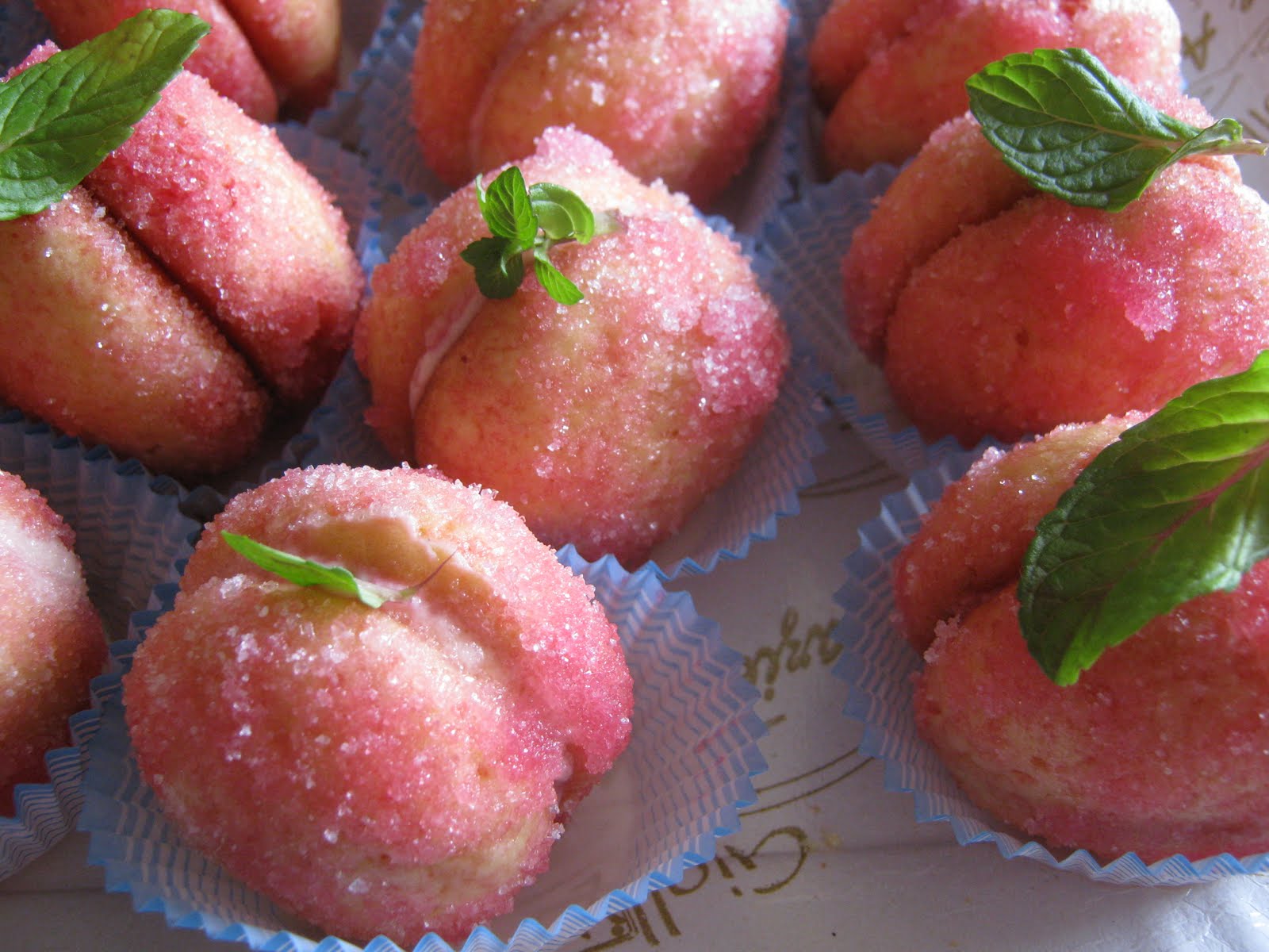 Raschiare le pesche nella parte poggiata alla teglia riempirle con la nutella, unirle, bagnarle nell'Alchermes e poi farle rotolare nello zucchero