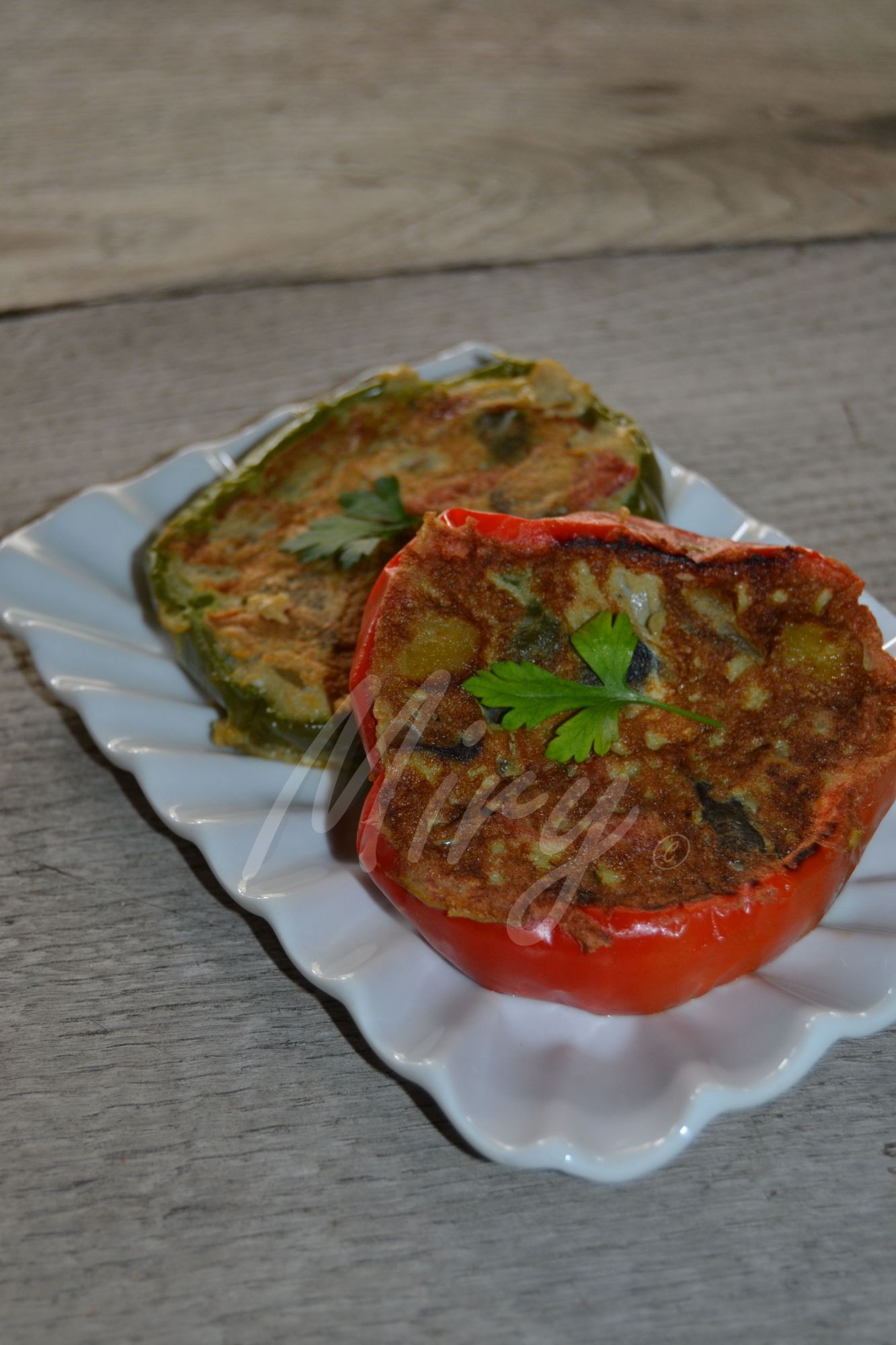 In una padella antiaderente mettere un filino di olio, adagiare il disco di peperone e al suo interno versare il composto di uova e verdure fino quasi al bordo. Cuocere come una normale frittata: a metà cottura girarla con una paletta facendo attenzione a non rovesciarne il contenuto