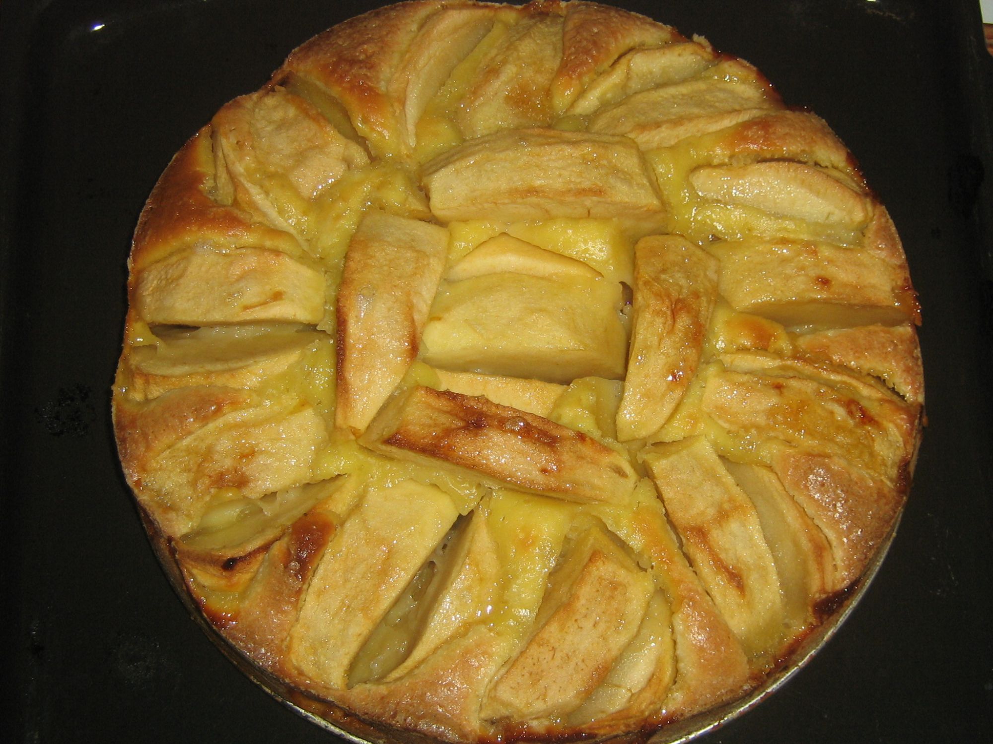 Versare il composto in una teglia imburrata ed infarinata di circa 27 cm, sistemare le mele a raggiera, spolverizzare con un pò di zucchero ed infornare a 180° per 35 minuti, finchè risulta dorata in superficie.
