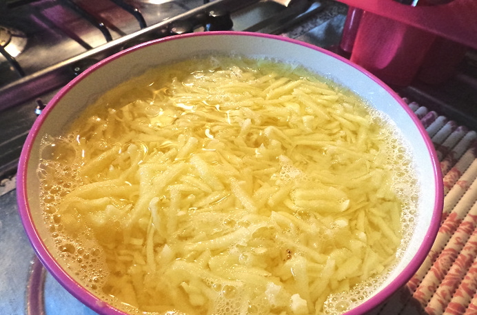 Pelare e lavare le patate, grattuggiarle a scaglie e metterle in una ciotola: unirvi la cipolla, l'uovo ( se necessario 2) e il formaggio.