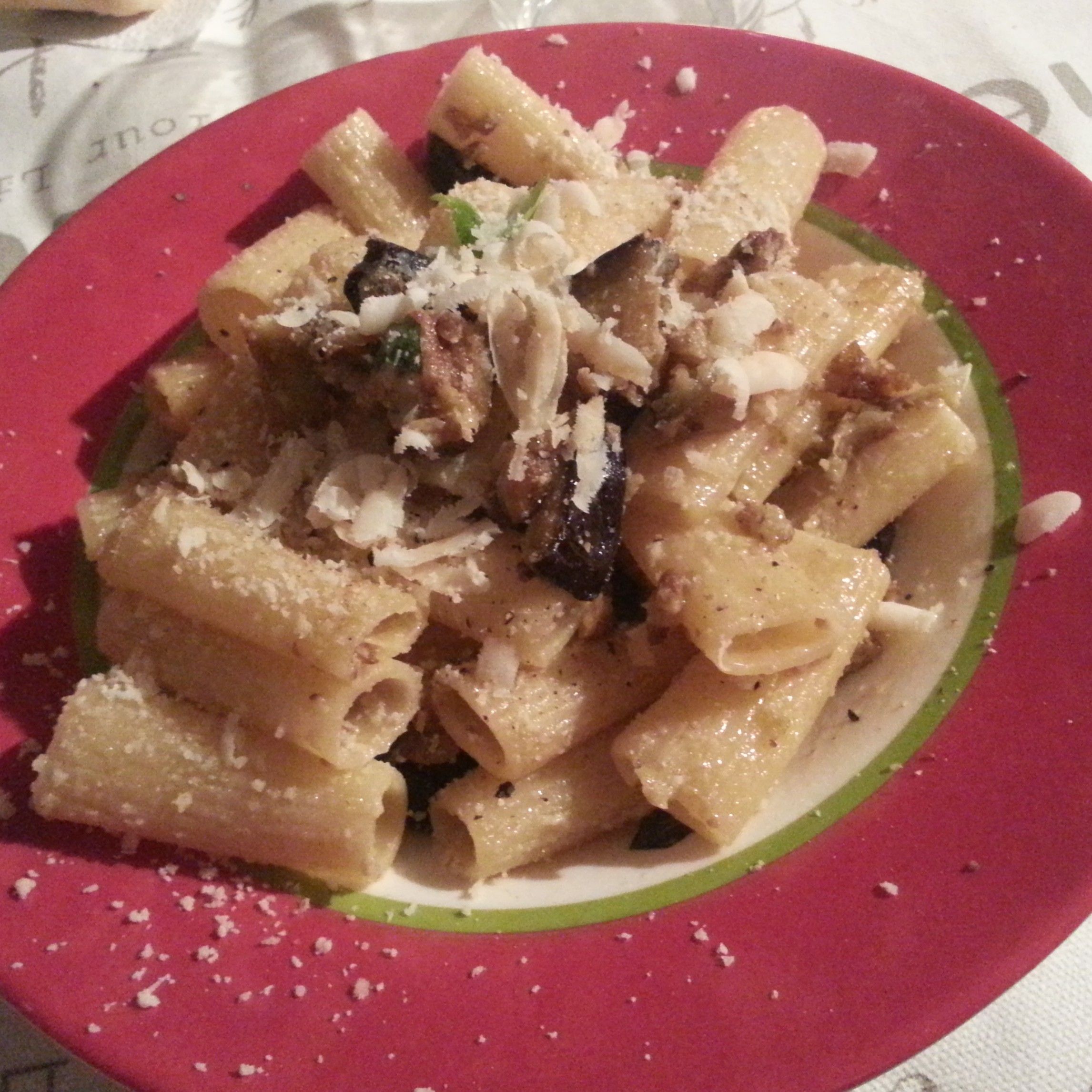 Rimettere la pasta nella pentola e, a fuoco basso, mescolare insieme alle melanzane fritte, la ricotta salata grattuggiata, il basilico e il pepe nero.