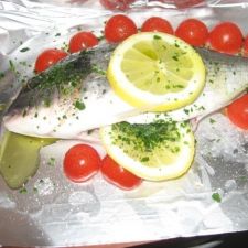 pulire il pesce,adagiare su una pirofila da forno della carta stagnola mettergli il pesce sopra con tutti gli ingredienti chiuderlo a cartoccio e metterlo nel forno per 20 minuti a 180grd