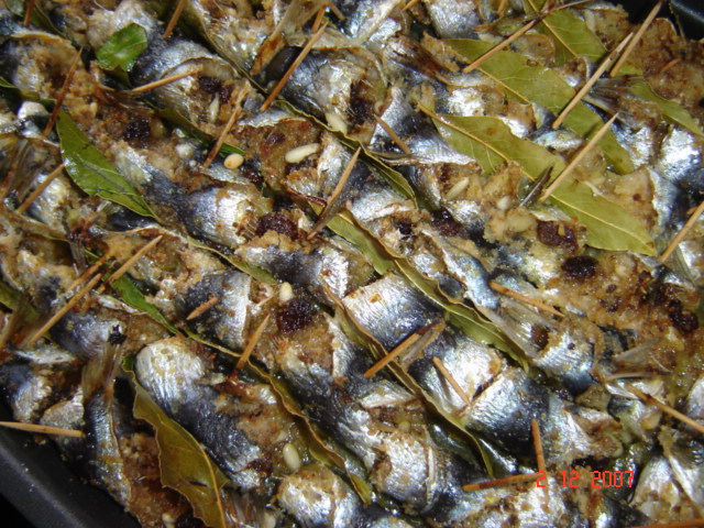 Disporre le sarde su una teglia oleata e mettere delle foglie d'alloro tra le sarde, irrorare con il succo di 1 limone a cui si sarà aggiunto un pò di zucchero.