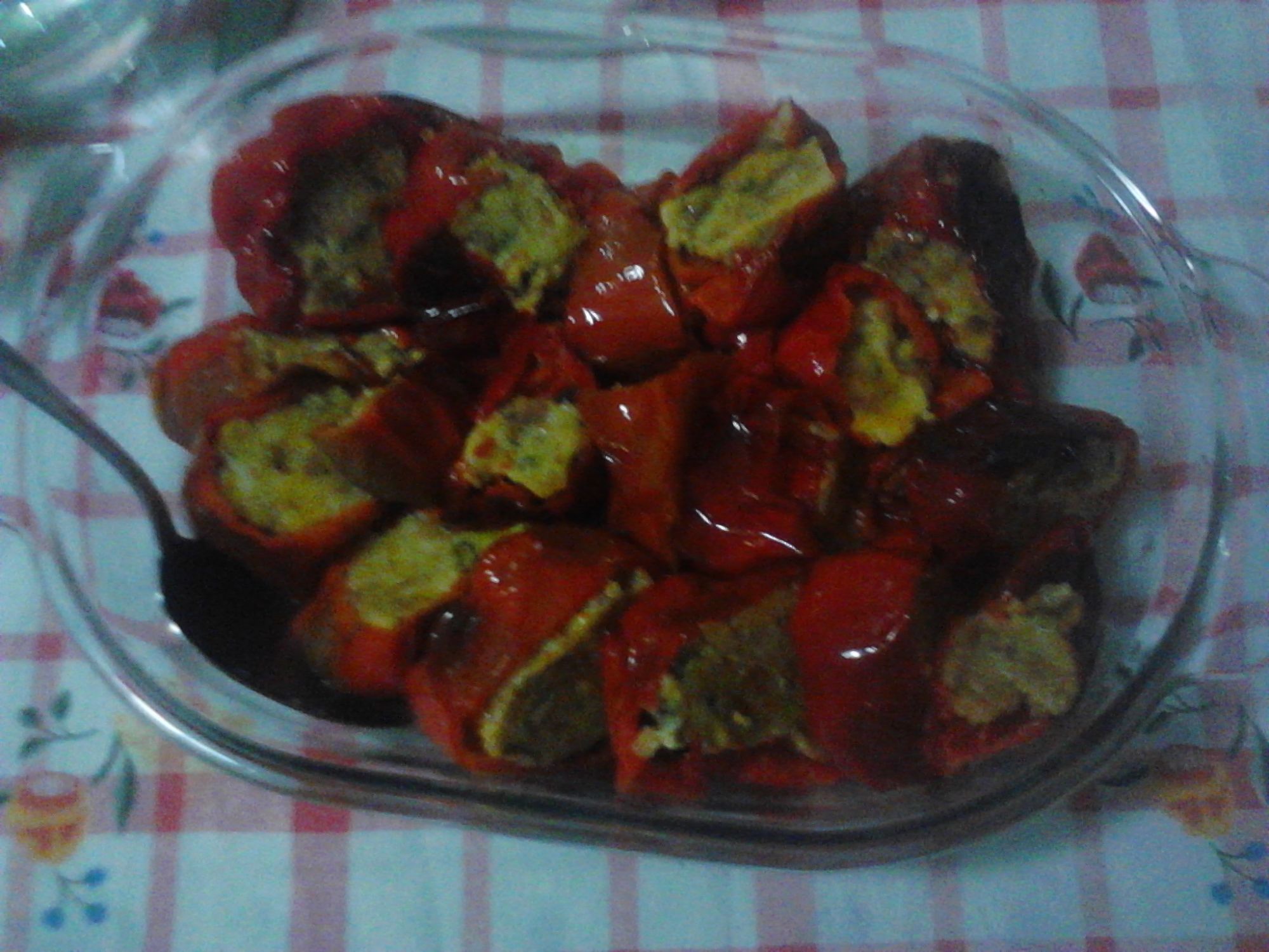Riempite i peperoni con il ripieno e spolverate con del pangrattato se avete utilizzato i peperoni tagliati a metà, diversamente coprite con la calottina del peperone tagliata precedentemente.