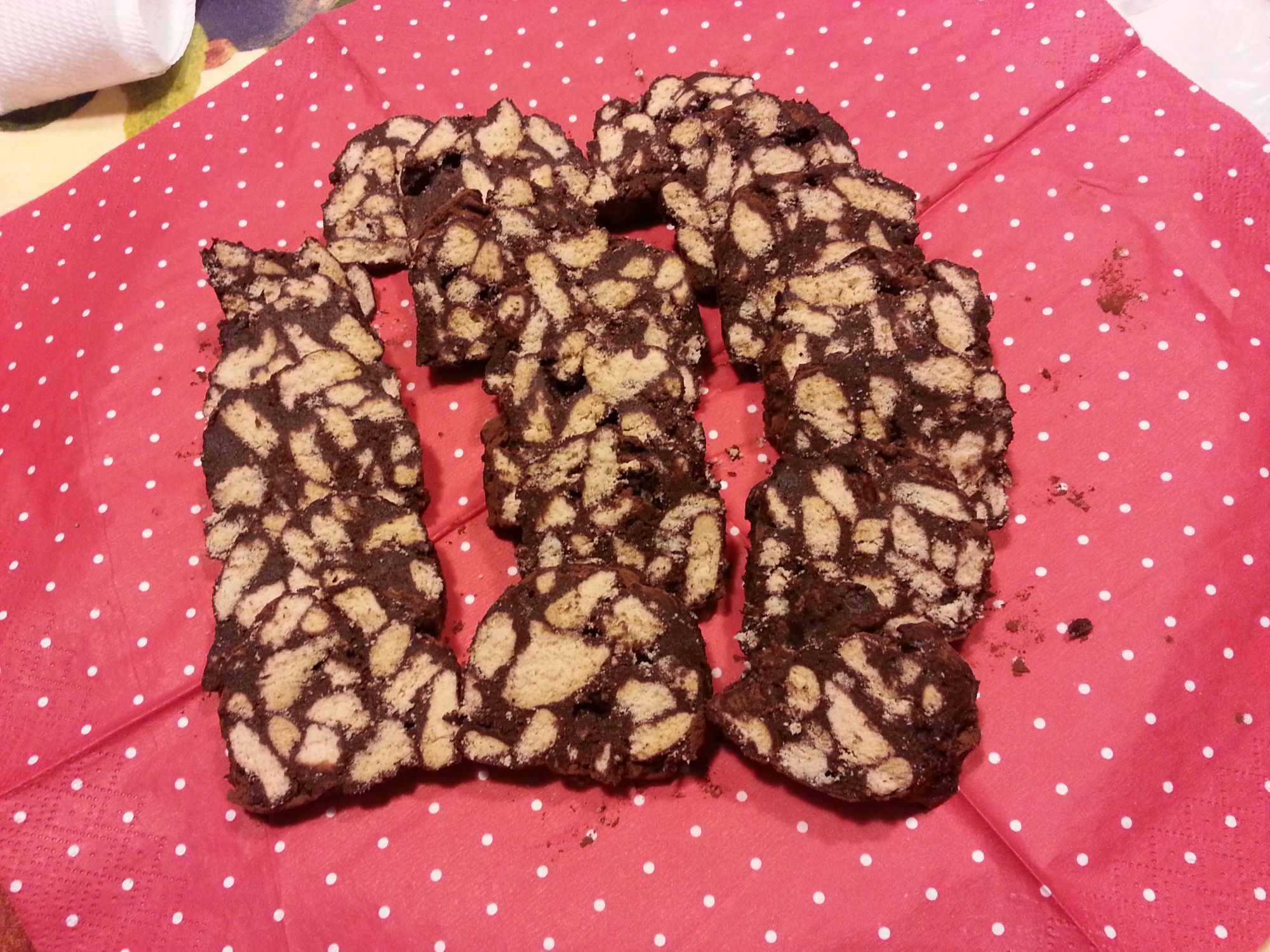 Uscire dal frigo e servire il salame di cioccolato tagliato a fette.