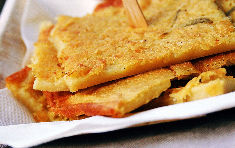 Mescolare la farina di ceci con l'acqua e lasciar riposare l'impasto per almeno 5 ore.
