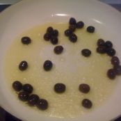 A questo punto prendiamo una padella con un diametro largo e mettiamoci un po’ di olio d’oliva e della cipolla. Inseriamo anche le olive nere che soffriggeranno per bene con la cipolla e doneranno il loro sapore all’olio.