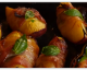 Tagliate le pesche in quarti. Appoggiate una fogliolina di basilico su ogni fettina di pesca. Arrotolate la pancetta intorno ad ogni fettina di pesca. Fate cuocere in forno per circa 10 minuti a 180°, o fino a quando la pancetta sarà croccante.