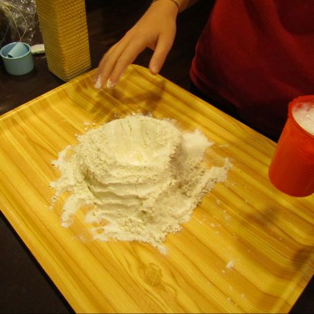 In un bicchiere di acqua TIEPIDA sciogliere il lievito e unire il composto al centro della fontana. Unire anche l'olio e cominciare ad impastare.
