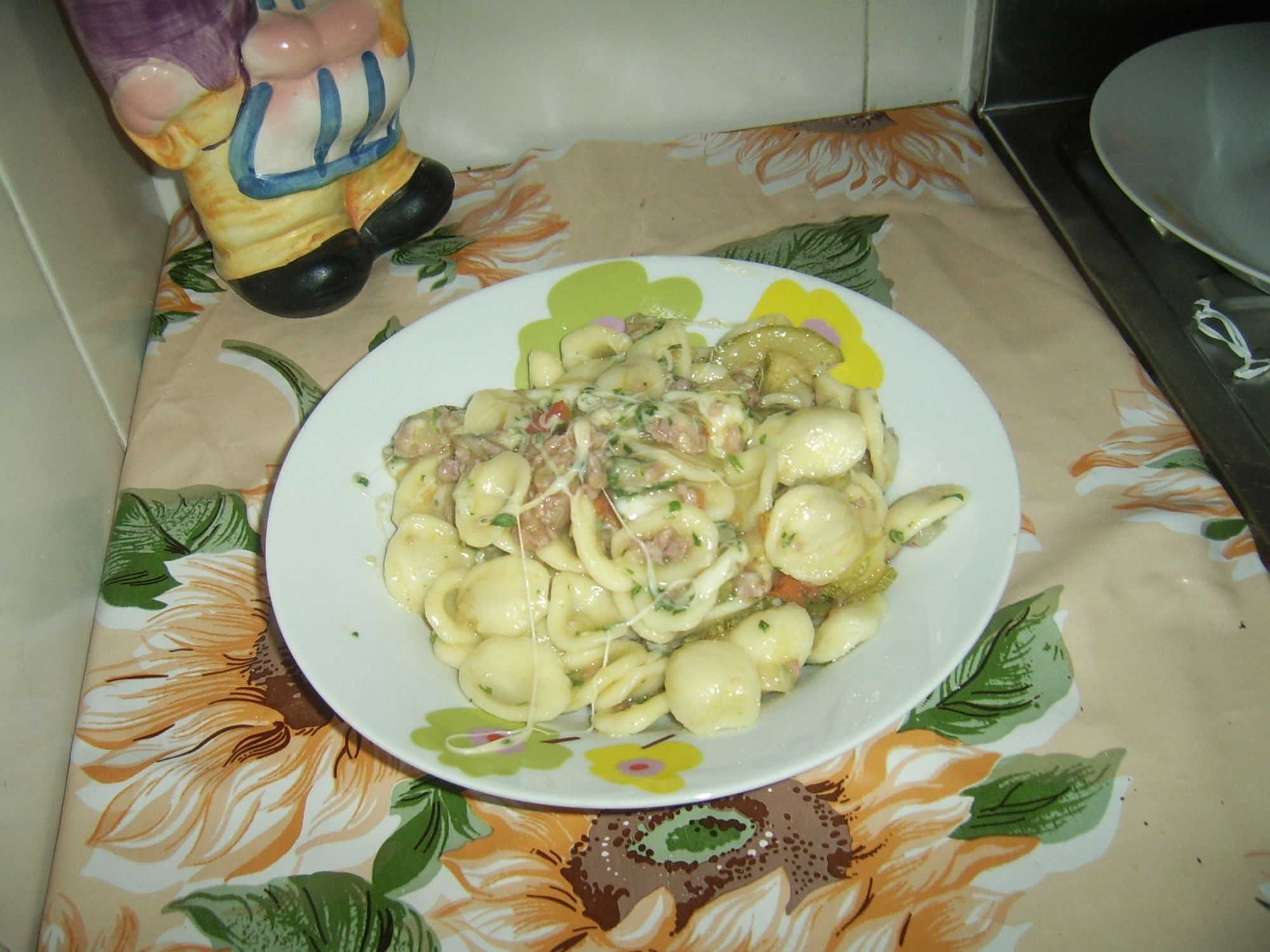 Lessare la pasta e scolarla al dente,ripassare il tutto in un tegame con le zucchine, i pomodorini, la salsiccia e aggiungere la dadolata di provola affumicata fino a che non diventi filante per ultimo aggiungere la rucola tritata finemente e a piacere spolverizzare il piatto con una abbondante grattata di parmigiano o grana