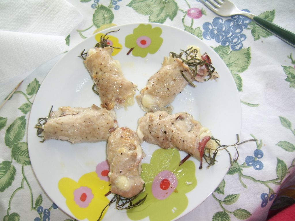 Aromatizzate ciascun rotolino con un ciuffo di rosmarino. Procedete allo stesso modo con tutte le altre fette di pollo. Ora i rotolini di pollo ripieni sono pronti per la cottura: scaldate una griglia spennellata con poco olio di semi, cuocete da entrambi i lati gli involtini, almeno 6/7 minuti per lato finché non risulteranno ben grigliati infine salate e pepate; lasciateli riposare poi sopra un piatto qualche minuto prima di togliere lo stuzzicadenti. In alternativa potete cuocere i rotolini di pollo ripieni in padella oppure al forno: spennellate con olio una pirofila e adagiate all’interno gli spiedini, cuocete in forno preriscaldato a 180° per 20 minuti circa avendo cura di girare i rotolini a metà cottura.