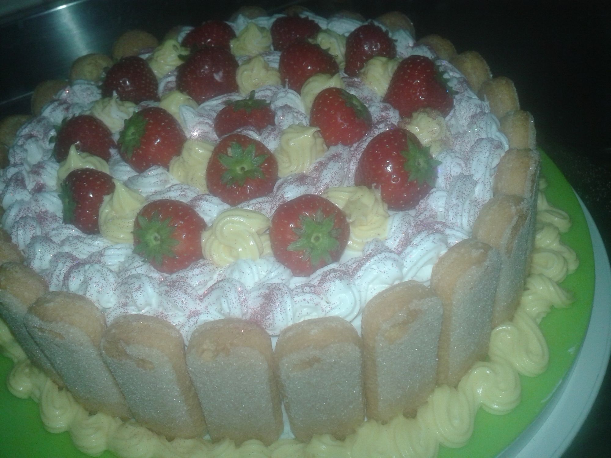 mettere sul primo disco di pan di spagna la crema ben fredda e chiudere con l’altro disco. Montare la panna.Spalmare su tutta la tortaanche lati,e poi mettere i savoiardi intorno se sono lunghi tagliarli, poi decorare sopra a piacere con una pac poche con altra panna,fragole,crema e glitter