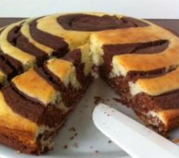 Imburrare e infarinare un teglia e comporre la torta partendo dal centro con una cucchiaiata di impasto bianco e alternare sovrapponendo un’altra dose uguale di impasto al cioccolato, creando una serie di cerchi concentrici fino ad esaurire l’impasto.