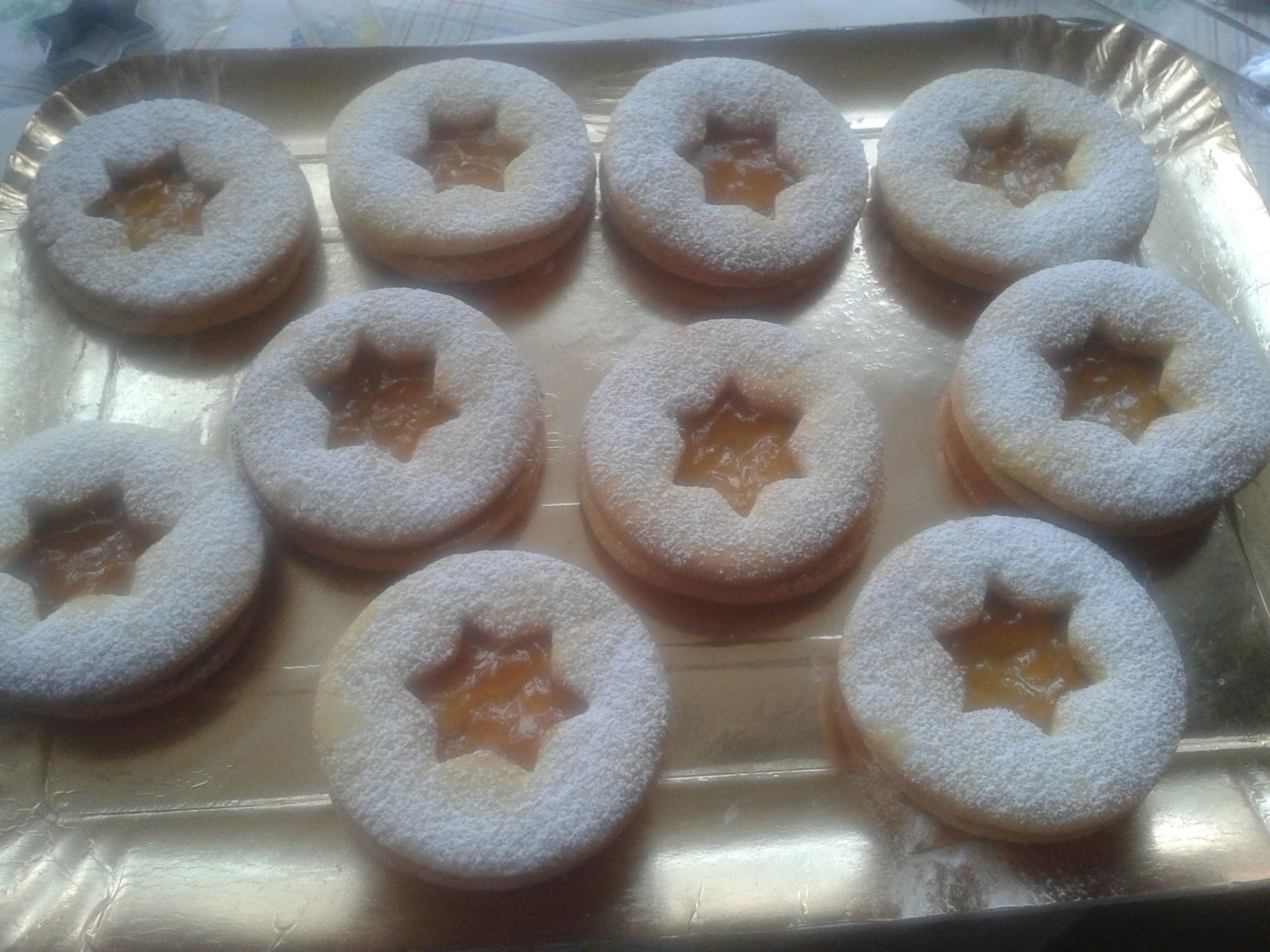 Distribuire un pò di marmellata al centro del biscotto rotondo(io lo spalmata su tutto il biscotto e ne ho messa un po di piu al centro) e chiudere con il biscotto forato, in modo che la marmellata sia ben visibile