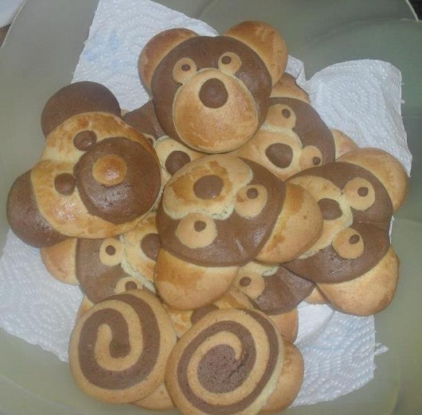 Impastare la margarina morbida con lo zucchero, aggiungere le uova, poi la farina insieme alla vanillina e il lievito tutto una volta. Dividere l'impasto in due parti uguali e in una aggiungere il cacao.