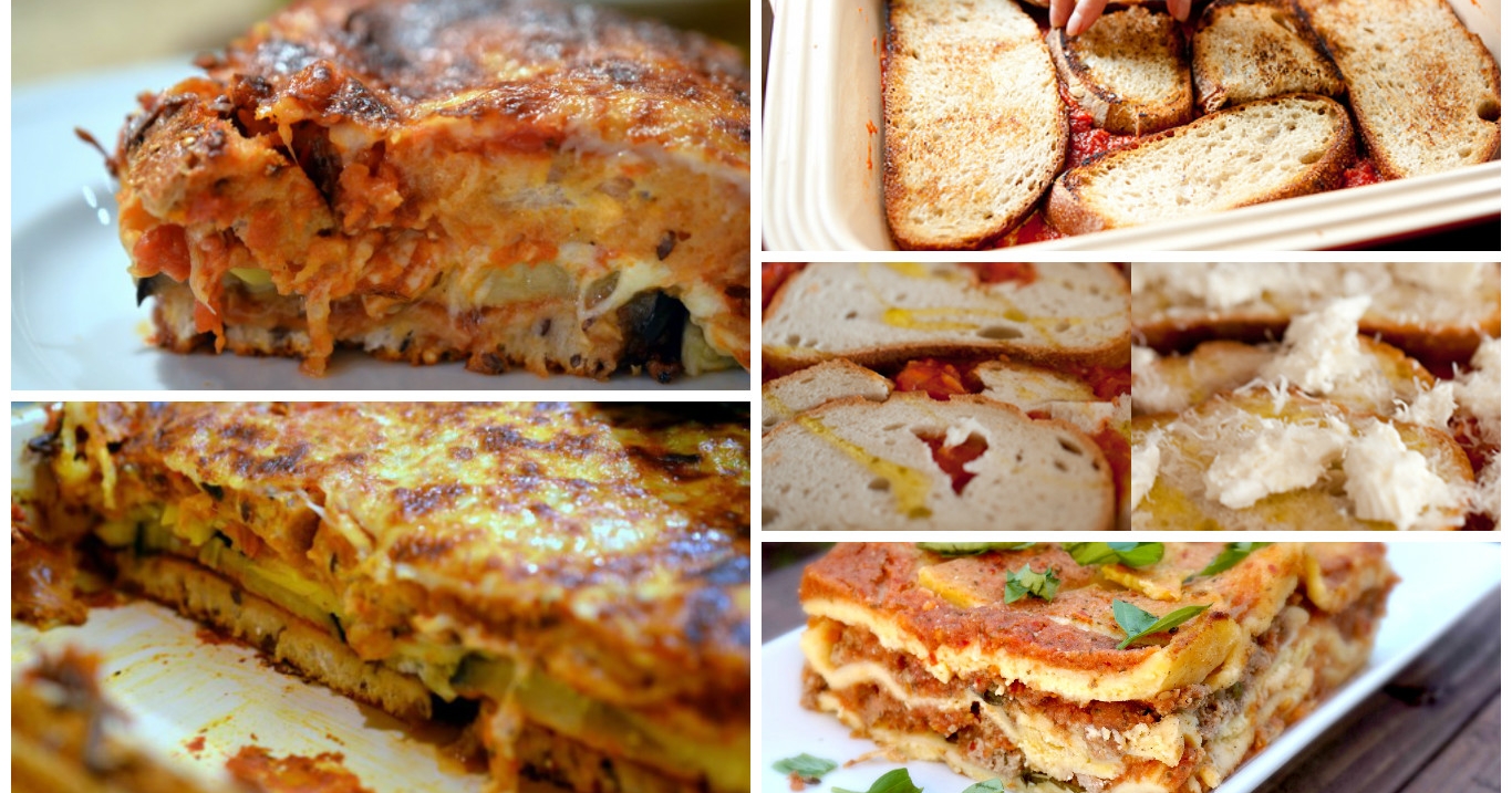 Cominciate coprendo il fondo di una pirofila con il sugo di pomodoro, adagiatevi quindi le fette di pane bagnate nel brodo vegetale.