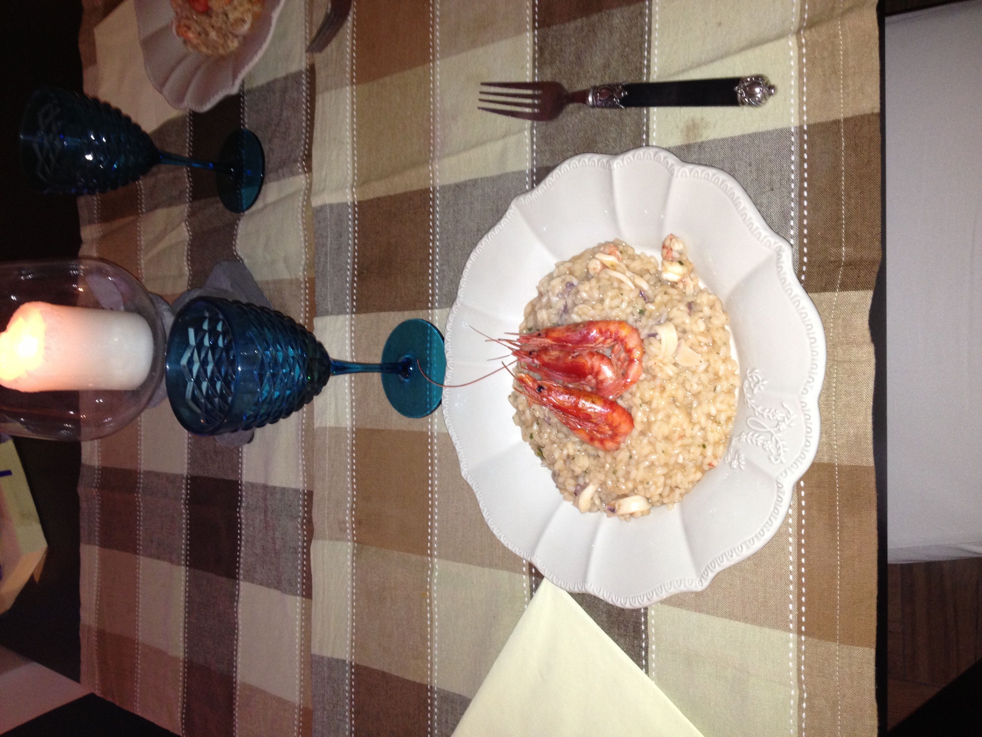 - 280g di riso arborio; 1/2 kg di gamberoni rossi; vino bianco; aglio; uno scalogno. Per il brodo: 1 l di acqua; 1/2 carota; 1 patata; 1 costa di sedano; 1 pesce a vostra scelta.