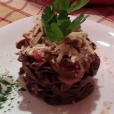 Impastare la farina con le uova, il cacao e un pizzico di sale. Tirare una normale sfoglia e da essa ricavare le tagliatelle. Cuocere la pasta in acqua salata.