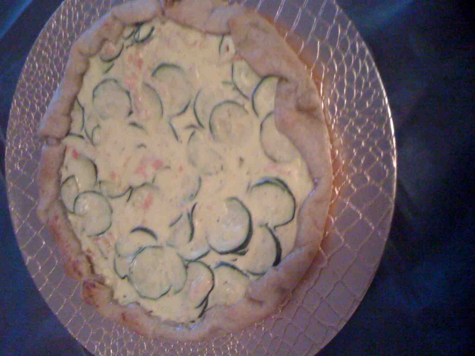 Stendere il rotolo di pasta sfoglia in una teglia foderata con carta da forno, versarvi il composto e decorare con strisce di zucchina.