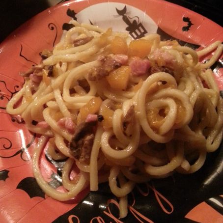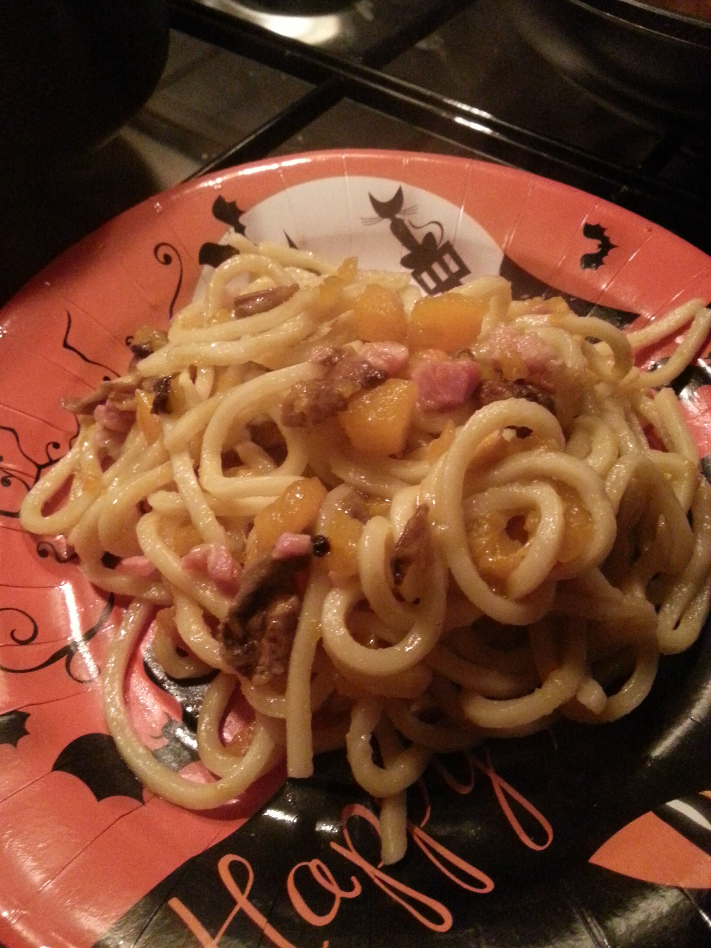 Unire i funghi alla pancetta aggiungendo anche un pizzico di pepe. Togliere la zucca dal microonde, tagliarla a pezzetti e farla rosolare nella stessa pentola.