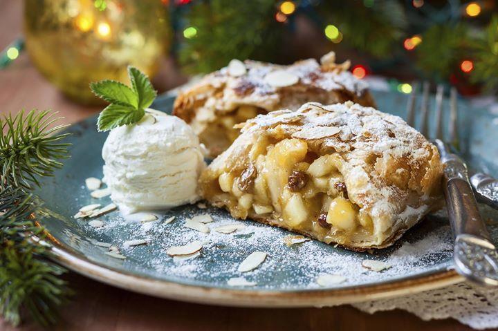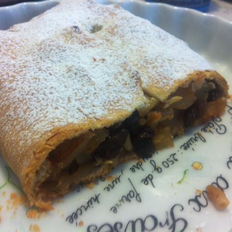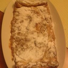 Stendere con il mattarello la pasta in una sfoglia sottile, cospargerla con 50 gr di pangrattato tostato in poco burro, distribuire il ripieno di mele e, con l'aiuto di un canovaccio, arrotolare la pasta su se stessa a strudel.