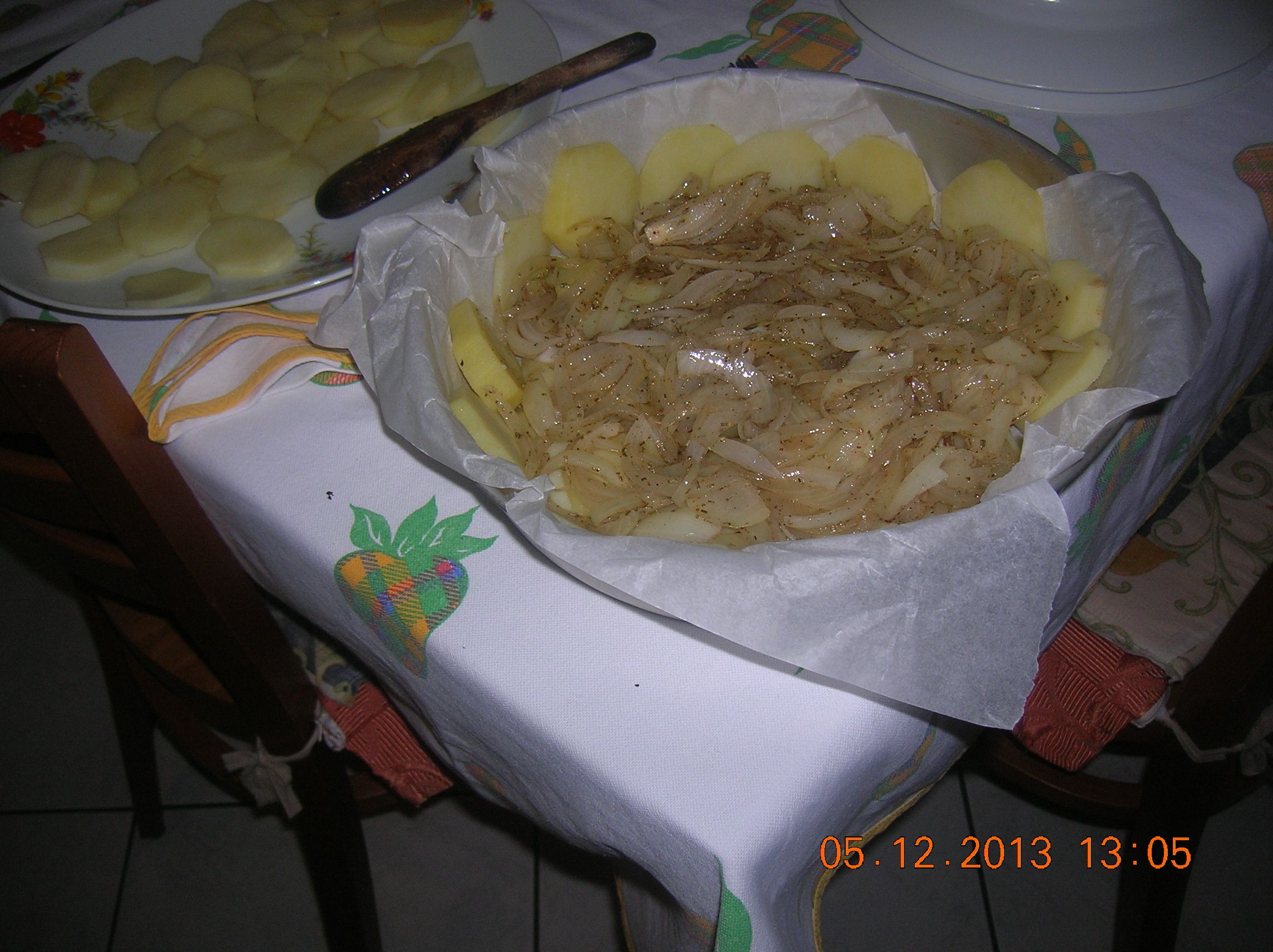 - Ho pulito e fatto a rondelle le papate che poi ho messo in un tegame di acqua bollente ..fatto fare un bollore di circa 2'... fatto freddare ...nel frattempo ho affettato due cipolle che ho fatto stufare in 80gr. di margarina vegetale sul gas... dove ho messo pepe, sale ..noce moscata e rosmarino secco..Ho messo carta da forno in una teglia.... sul fondo ho messo uno strato di patate ...e anche sui lati messe in piedi ... hop versato le cipolle ...la mortadella e il formaggio a dadini....ricoperto con un altro strato di patate... fatto sciogliere i 20gr. di margarina rimasti dove ho unito un altro pizzico di rosmarino e l'hoversato sopra le patate.... ho infornato in forno caldo a 200° per 40' circa...