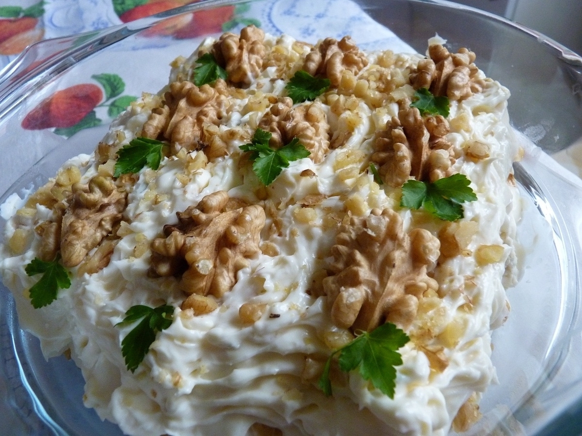 Sistemare su un vassoio uno strato di mascarpone, una spolverata di noci tritate grossolanamente, stendere la gorgonzola e sopra altre noci tritate; infine coprire con la philadelphia e guarnire con i gherigli di noce e qualche fogliolina di prezzemolo.