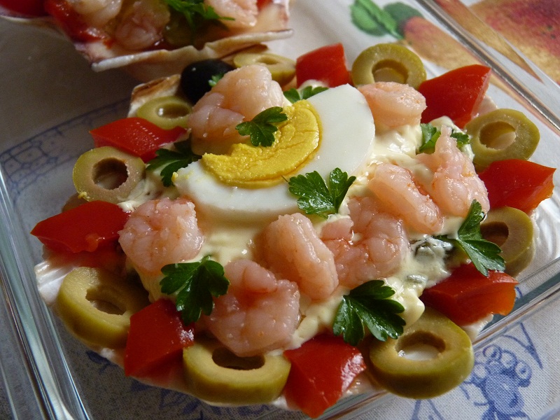 Mettere in ogni conchiglia due cucchiai di insalata russa, coprire con un velo di maionese e decorare a piacere con gamberoni sbollentati, fettine di uova, olive a rondelle, pisellini, o con quello che piace di più. Spalmare un pò di gelatina liquida sopra x dare un tocco in più