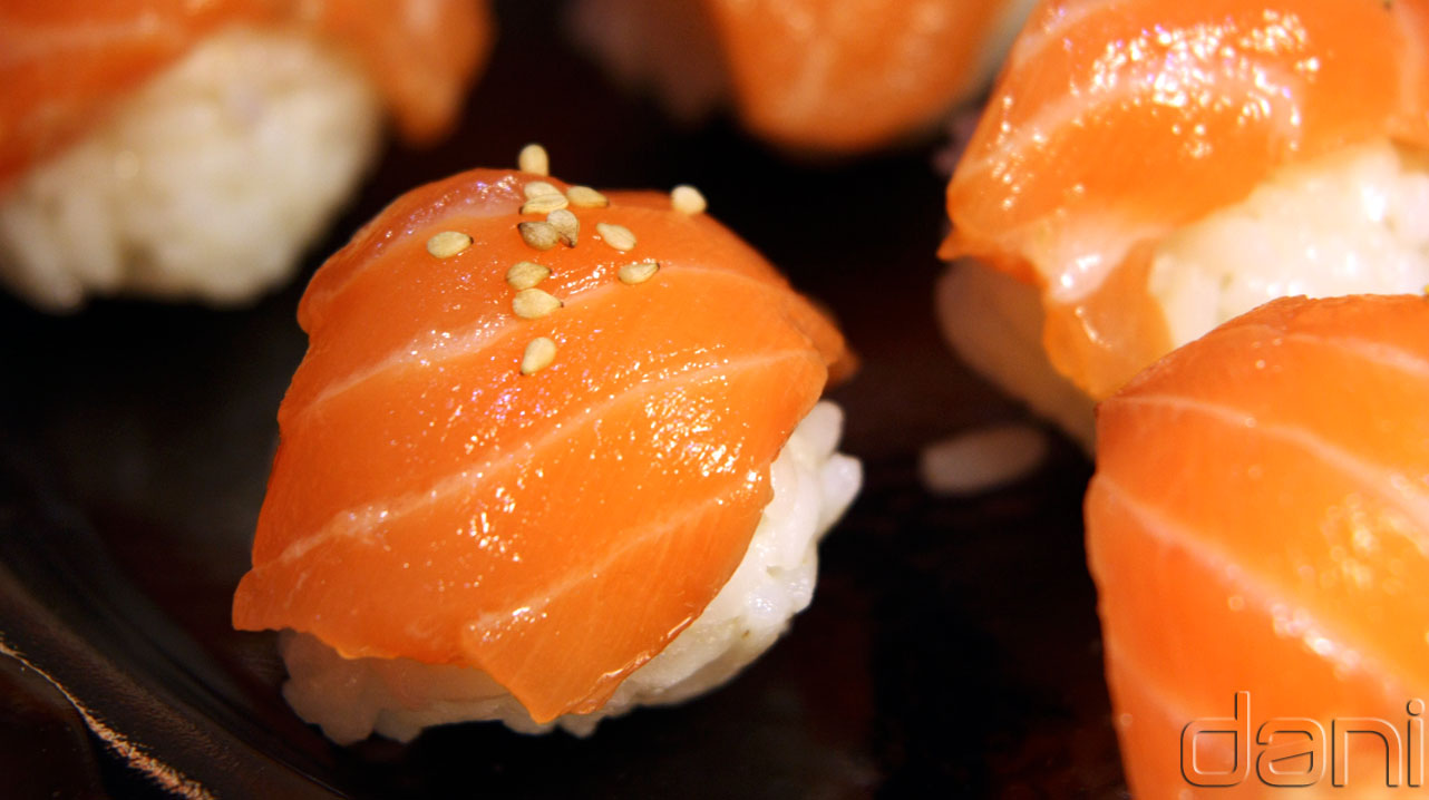 A riso raffreddato, formate delle palline con le mani bagnate (altrimenti si attacca tutto) e adagiateci sopra il salmone. Decorate con semi di sesamo.