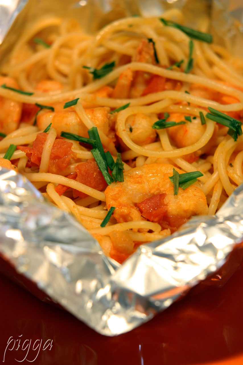 Disponete un foglio di stagnola sul tavolo e al centro mettete una porzione di spaghetti con i gamberi. Chiudete la stagnola come un fagottino. Fate lo stesso con l’altra porzione. Infornate i fagotti per circa 10min. a 180°C. Spolverate con un pizzico di peperoncino. A piacere aggiungete dell’erba cipollina. Semplicemente deliziosi!!