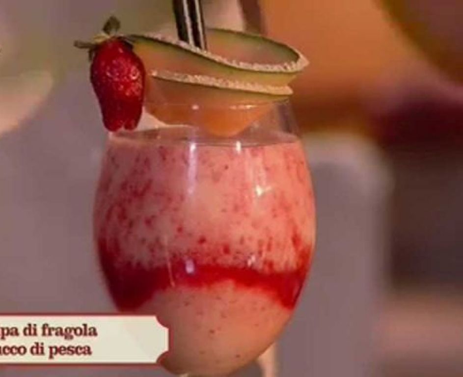 Mettere la polpa delle fragole nel bicchiere e nel frattempo unire nel frullatore la frutta con un pochino di ghiaccio, il succo di pesca e una spolverata di zucchero; frullare bene il tutto fino a che il ghiaccio non si è completamente tritato e unire questa crema nel bicchiere con la polpa delle fragole. Servire il cocktail di primavera con alcuni cubetti di frutta.