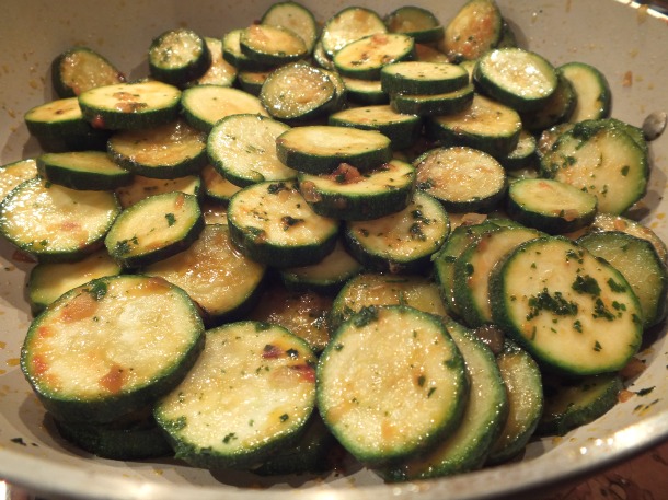 cuocere le zucchine in una padella con un filo d' olio e l' aglio per 10 min a fuoco vivo.