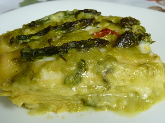 Raschiare, pulire e lavare bene gli asparagi, tagliare le punte e metterle da parte. Tagliare i gambi a pezzettini e metterli a cuocere con un pò di olio, 2 spicchi d' aglio e 1/3 del peperoncino tagliato a rondelle. Aggiungere l'acqua a filo. Aggiustare di sale e pepe e cuocere per circa 15- 20 minuti. Trascorso il tempo frullare il tutto finché diventa una crema. In un pentolino più piccolo, mettere 2 cucchiai di olio, lo spicchio d' aglio rimasto e il restante peperoncino, aggiungere 2 cucchiai di acqua, insaporire di sale e pepe e cuocere a fuoco medio finché l'acqua scade. Ora che abbiamo tutto pronto, prendiamo una pirofila perché è ora di assemblare il tutto. Spalmare sul fondo della pirofila uno strato di besciamella, mettere un strato di pasta, di nuovo uno strato di besciamella, uno di crema agli asparagi e uno di formaggio . Proseguire con gli altri ingredienti fino ad esaurimento. Sopra l'ultimo strato, mettere la besciamella, la cremina, le punte di asparagi saltate in padella ed infine il formaggio grattugiato. Cuocere in forno caldo a 180° per circa 20 minuti. E' una vera delizia.