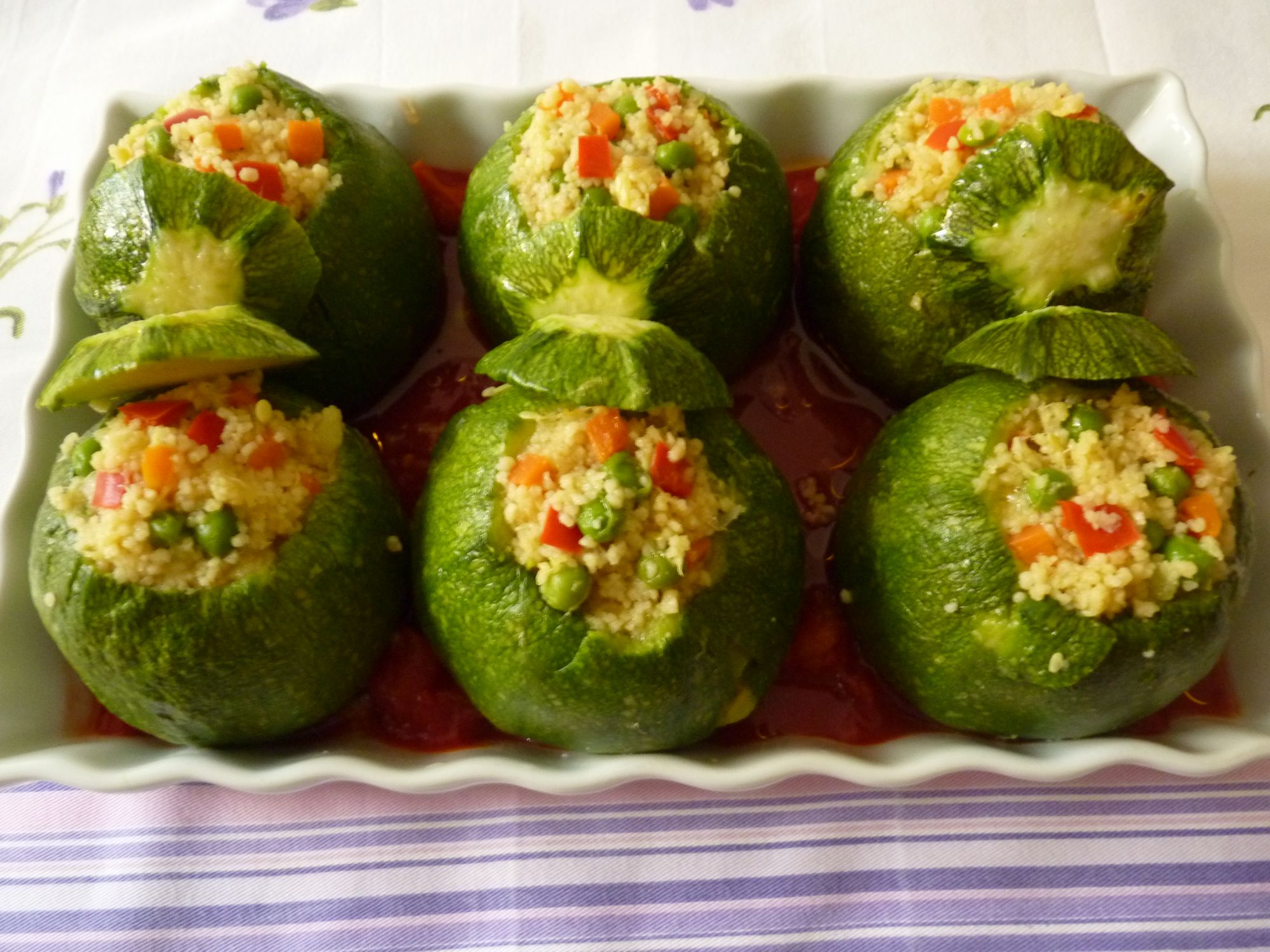 In una piccola padella mettere a bollire l' acqua con 1/2 cucchiaino di sale e 1 cucchiaio di olio, appena inizia a bollire spegnere il fuoco, unire il cous cous, mescolare e lasciare assorbire tutta l' acqua dopodiché sgranare con una forchetta e unirlo nella padella con le verdure. Aggiungere il formaggio, mescolare, insaporire di sale e pepe e riempire le zucchine con questo composto. Sistemare le zucchine in una teglia, dopo aver messo la polpa di pomodoro sul fondo e cuocerle a 180° per circa 20 minuti.
